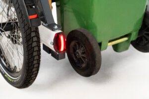 Gracias a la estructura de su parte trasera, este triciclo de limpieza viaria puede transportar un cubo de 90L y hasta 4 escobas.